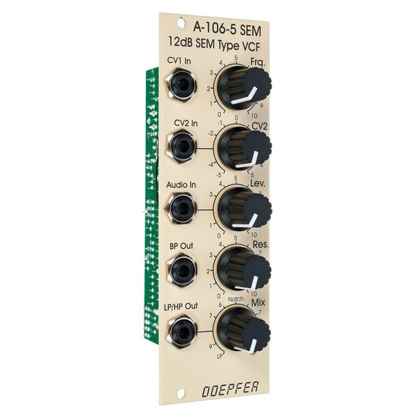 „Doepfer A-106-5 Special Edition“ (kreminis) sujungia pamėgtą SEM stiliaus analoginio filtro charakterį su ryškia vintažine estetika. Šis daugiamodis filtras turi žemo dažnio, juostinio ir aukšto dažnio režimus su švelniu 12 dB oktavos nuolydžiu, perteikdamas šiltas, muzikalias tekstūras, idealiai tinkančias subtraktyviai sintezei ir kitoms reikmėms.