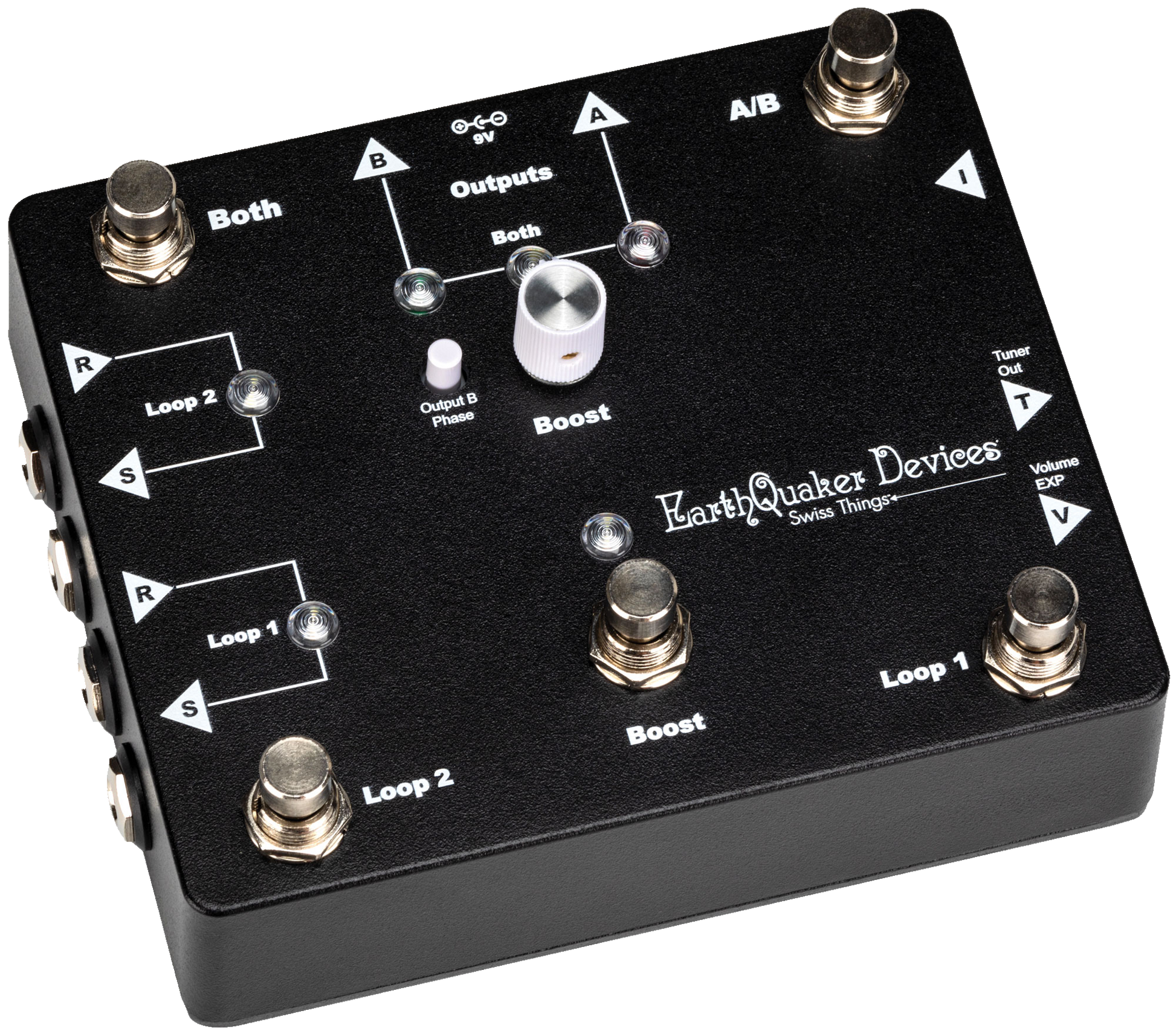 „ EarthQuaker Devices Swiss Things“ – tai išsamus pedalų signalo valdymo sprendimas. Šis universalus pedalas turi dvi perjungiamas efektų kilpas, ABY dėžutę stiprintuvo valdymui, perjungiamą 20 dB švaraus garso sustiprinimą ir išraiškos įvestį garsumo valdymui. Nesvarbu, ar norite išlaikyti švarius tonus, ar sklandžiai kurti sluoksnių efektus, „Swiss Things“ siūlo minimalų signalo praradimą ir maksimalų lankstumą.