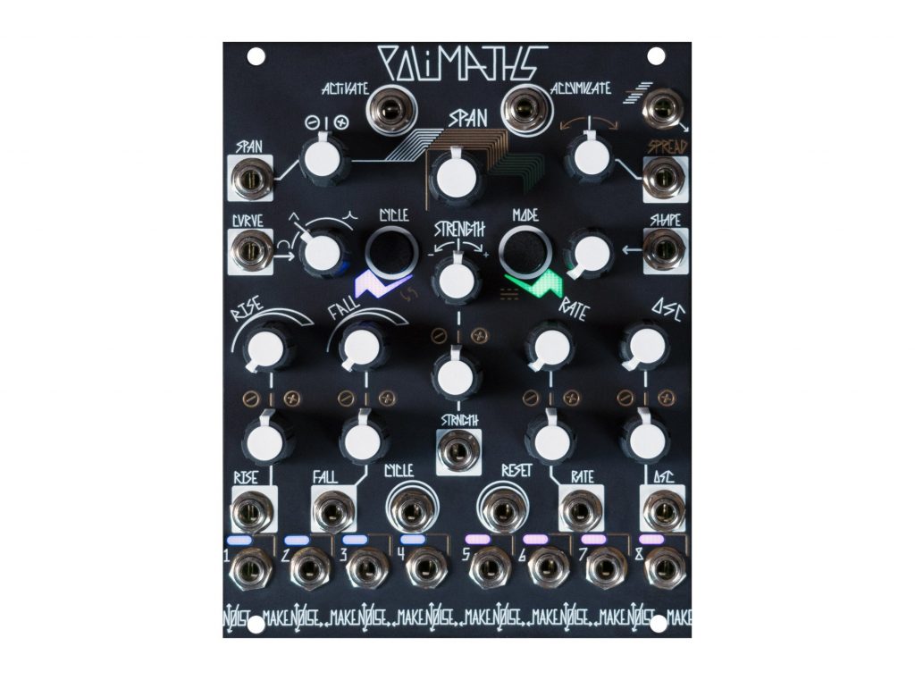 PoliMATHS is an eight-channel CV and Audio event generator for the New Universal Synthesizer System or any Eurorack modular synthesizer. It uses a single set of controls to generate complex functions at eight independent channel outputs. PoliMATHS’ functions are made up of two components: first, the well-known Rise-Fall envelope with variable Curve (familiar from the original MATHS and Function and 0-Coast Slope); and second, a variable-Shape Oscillation whose amplitude is controlled over time by the Rise-Fall envelopes. This oscillation can be either low frequency for the creation of complex control functions, or audio frequency for native generation of audio events/notes with optional tuned pitch control via 1v/oct control voltage. PoliMATHS also includes output headers for creating pre-patched connections to the control inputs of QXG.