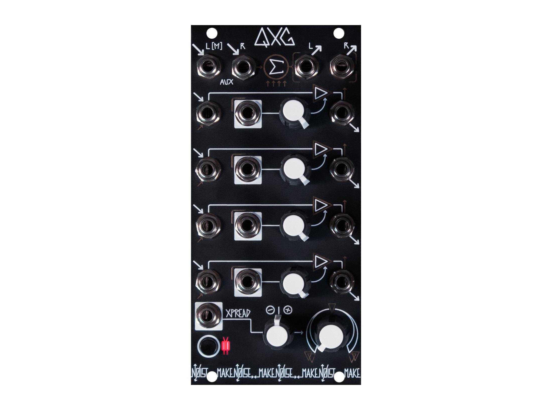 The Quad Stereo Gate (QXG) music synthesizer module is a Four Channel Stereo Low Pass Gate and Mixer. Like the DXG before it, the QXG utilizes a new low pass gate circuit that does not use vactrols. This circuit is 100% analog and its response was arrived at after many months tailoring it to meet or exceed the expectations that have been set by all the vactrol low pass gates that Make Noise has created over the years. Additionally the QXG adds a Vactrol button to select between a Slow, low-pass-gate-like response emulating the decay time of a vactrol (Vactrol button ON), and a Fast precision response that still maintains the gentle filtering characteristic (Vactrol button OFF). Fast response can be especially useful when patching QXG with complex and quickly-changing functions such as those generated by PoliMATHS with the OSC circuit in use. The QXG also includes a Stereo Sum Output with voltage controllable Stereo Spread to quickly route all four channels across the stereo field. Each channel also has an individual output that removes the channel from the Sum when patched. In addition, QXG includes signal and control input headers for creating pre-patched connections from the outputs of PoliMATHS.