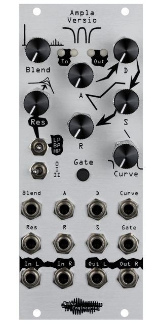 The Ampla Versio firmware offers a number of different dynamic and tone options: the Blend control fades between a pure VCA and a VCA/filter combo behaving similarly to a traditional lowpass gate, but with lowpass, bandpass, and highpass filter settings. The ADSR envelope is fully voltage controllable and also features a dynamic curve control, creating an expressive envelope you can shape to your liking.