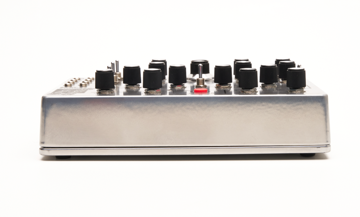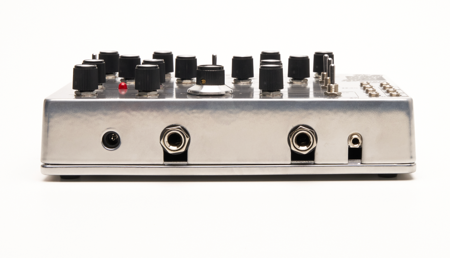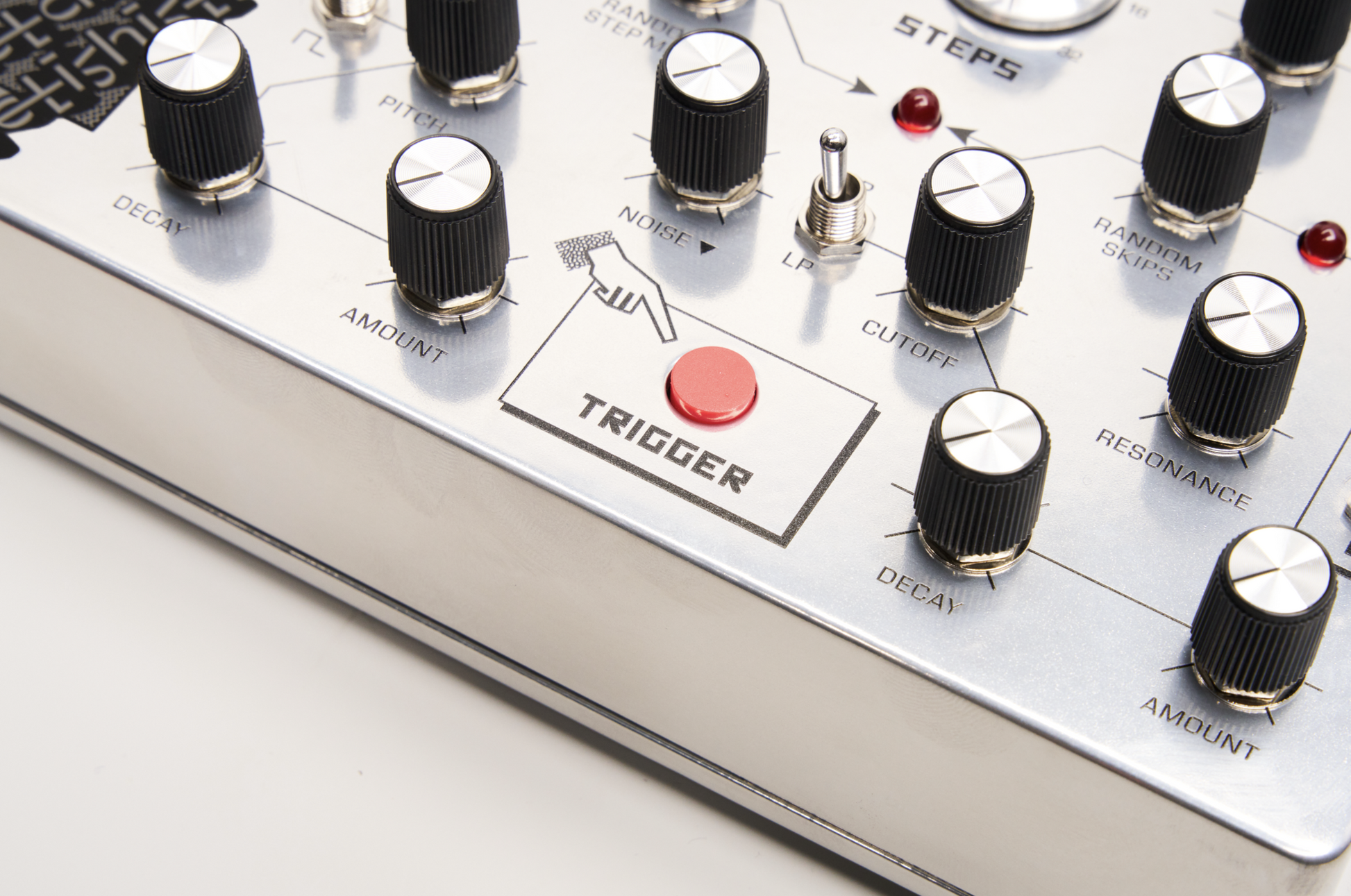 Two randomness generators manage the trigger probability and the step-modulation. Pitch, cutoff or an internal mixer that blends noise (or external audio) can be controlled by it. The STEPS knob locks the randomness into repeatable sequences of 2, 4, 8, 10, 16 or 32 steps.