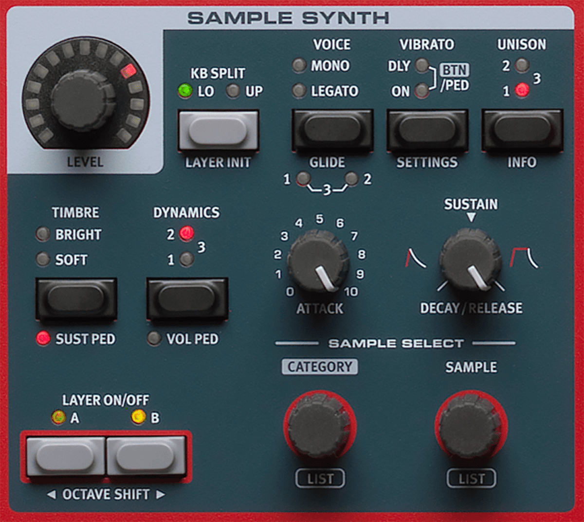 The Sample Synth section provides two fully-featured and independent Layers and is equipped with intuitive controls for attack, decay/release and dynamic velocity response. You can also create your own sample instruments using the unique free Nord Sample Editor software for Mac and Windows.