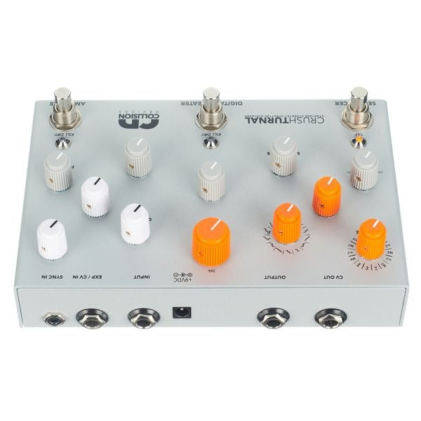 2) Digital Repeater (grey controls): digital delay and sample manipulation. A robotic repeater where each repeat can be continuously sampled and reduced. Ambience and Digital Repeater sections are controlled by the (large orange) Clock knob. This knob controls the clock frequency of the processor and affects the length of reverb and delay as well as the sample rate.