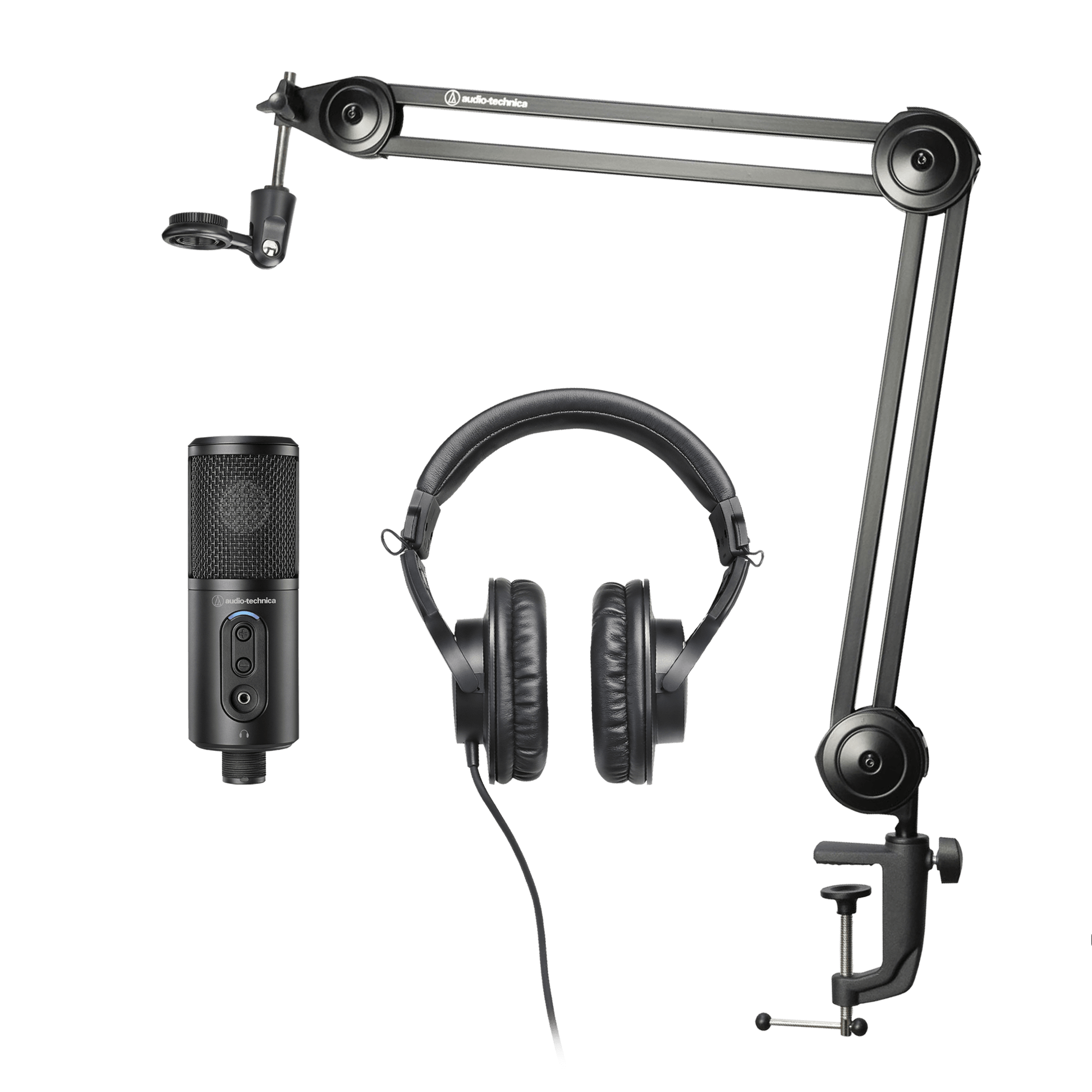 The Audio-Technica CREATOR PACK is an all-in-one solution designed for aspiring content creators, podcasters, and musicians. It includes the ATR2500x-USB cardioid condenser microphone, ATH-M20x professional monitor headphones, a desk boom arm, and a tripod desk stand, providing everything needed to start recording high-quality audio at home.
