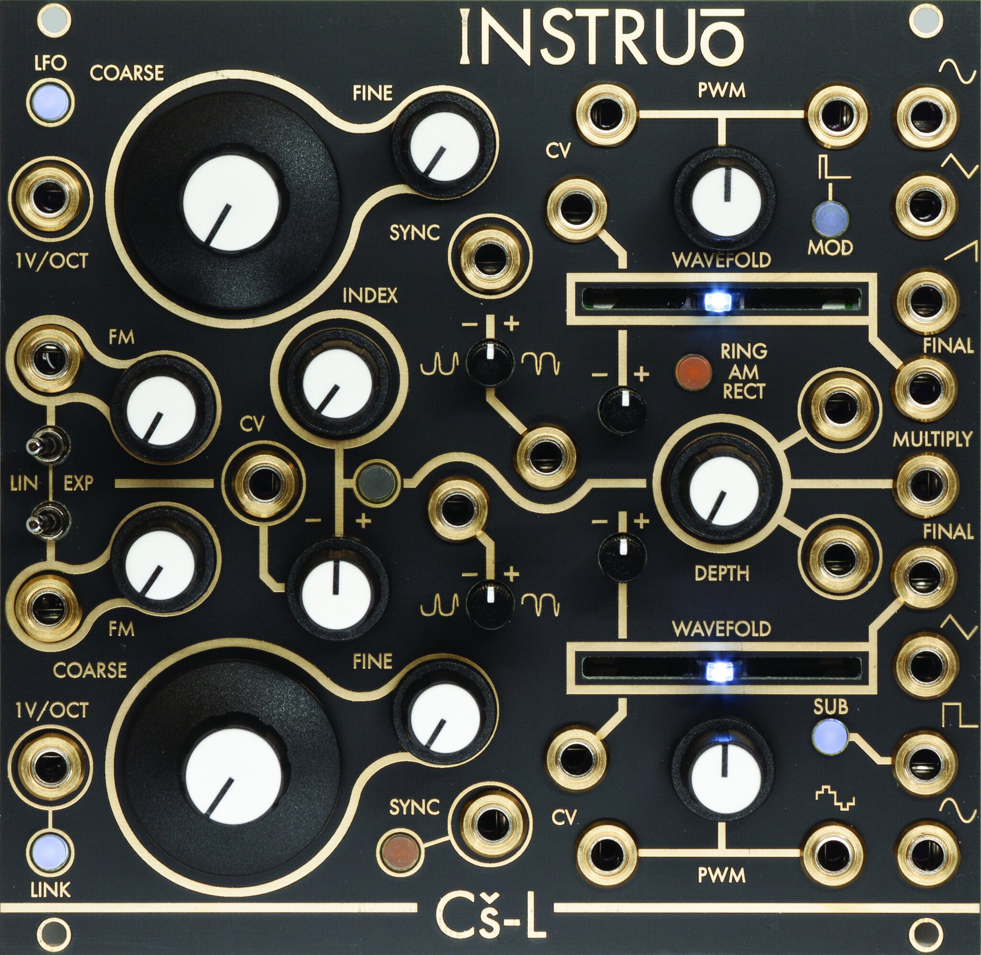 It expands upon the classic complex oscillator paradigm prominent in the West-coast synthesis philosophy. Typical cross modulation is expanded upon with inclusion of signal multiplication/amplitude modulation, a wavefolder per oscillator, final waveform symmetry biasing, classic and contemporary PWM, a global modulation index bus, and a digitally-controlled routing scheme that can be configured on-the-fly.