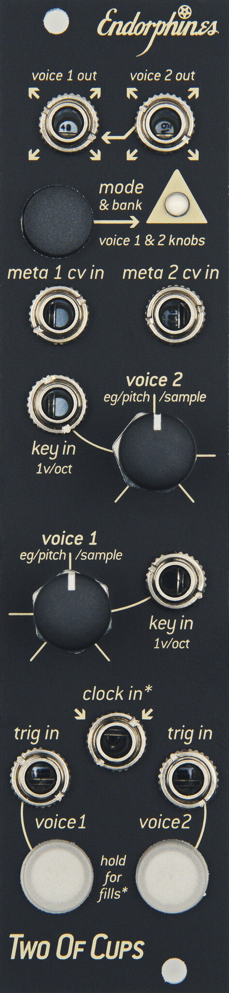 TWO OF CUPS – include samples in your live set. Two of them at once with a wide variety of CV-able features. Simply load one of 8 (!) banks each containing up to 24 samples for each of the two voices and off you go (unlock this feature with firmware 1.1!). Needless to say you can change the samples under CV and if needed – you can set up the trigger delay for each voice because that boy plays its sample so instantly and sample accurate with the with lightning speed. Breathe life and fresh sounds into your setup with a small footprint (6 HP) you would normally need to carry around a gazillion of gear to reproduce the sonic capabilities. Alternatively, use it the boring way and simply play drum one-shots off it.