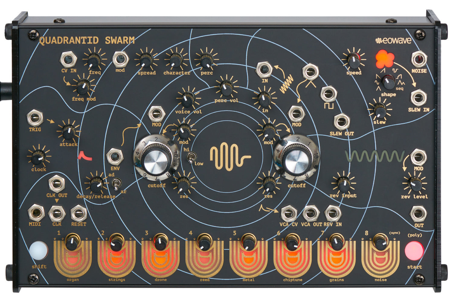The Quandrantid Swarm has MIDI and CV/Trig connectivity. Its normalized pre-patching allows you start creating immediately, but its semi-modular design allows you to use patch cables to explore the potential of this instrument.