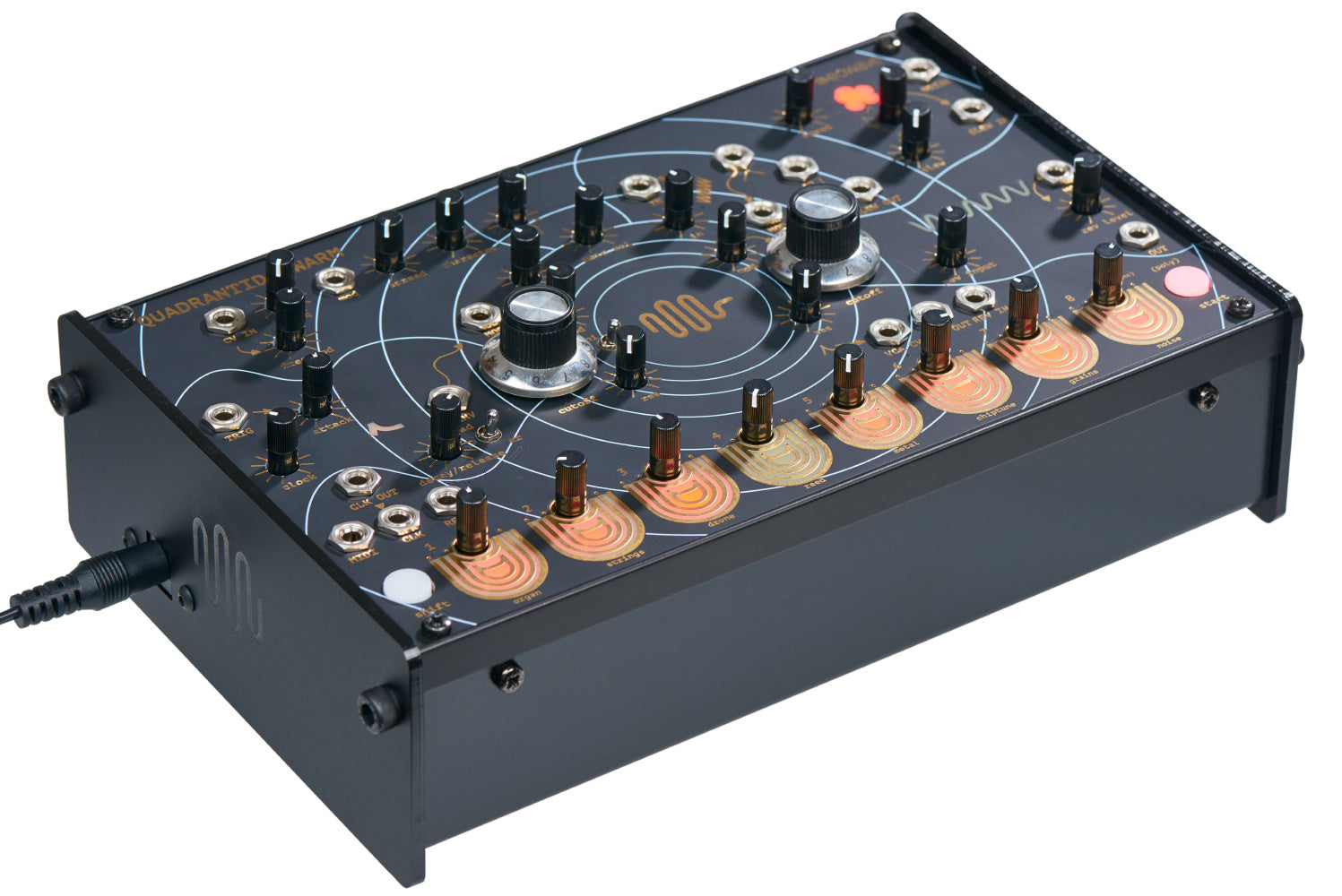 The Quandrantid Swarm is a digital synthesizer that features a percussive element to give it a unique sound. It contains a two-pole analog filter, an LFO with eight waveforms, and a spring reverb. The eight touch keys can be used as a mono keyboard, polyphonic keyboard or an eight-step sequencer.