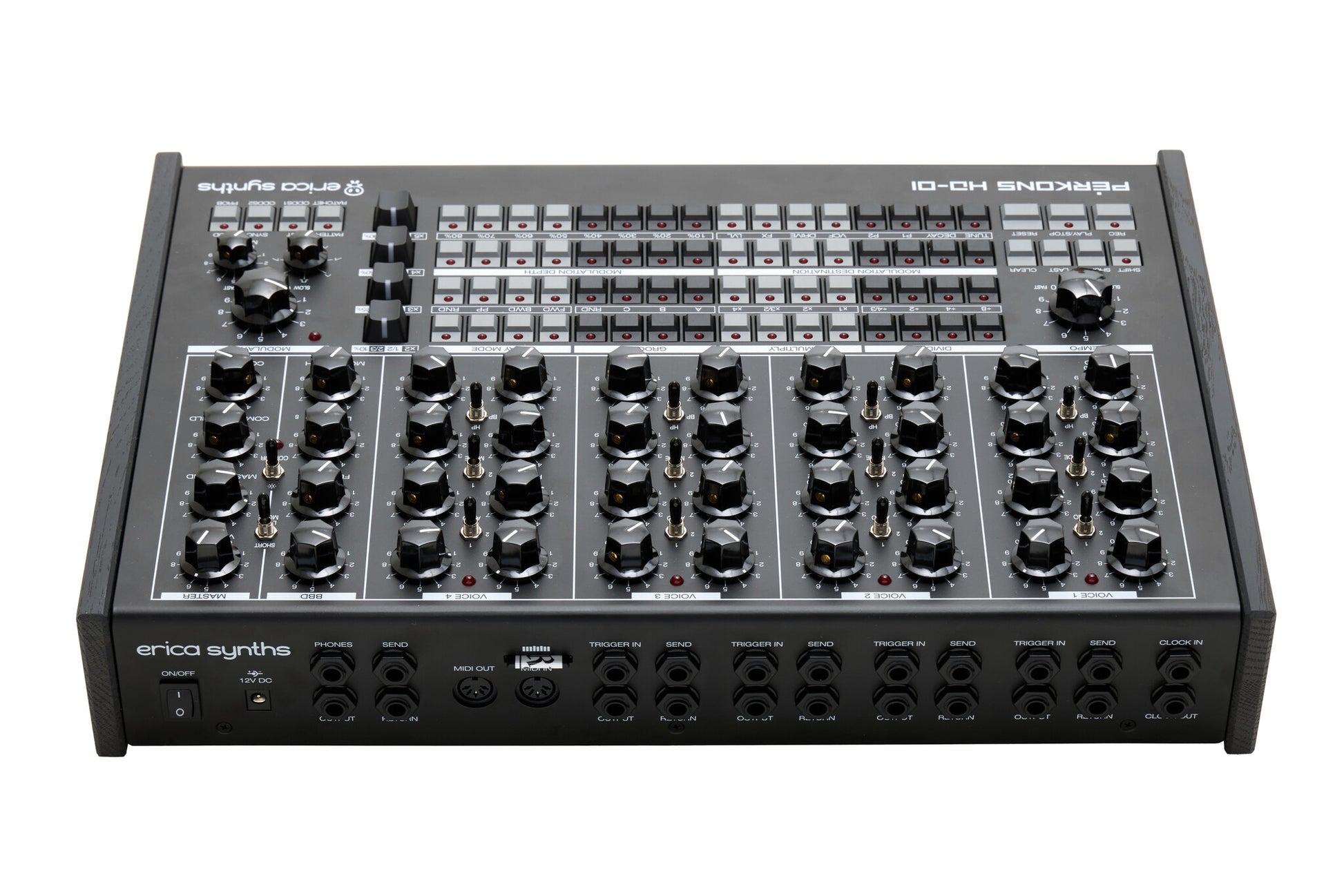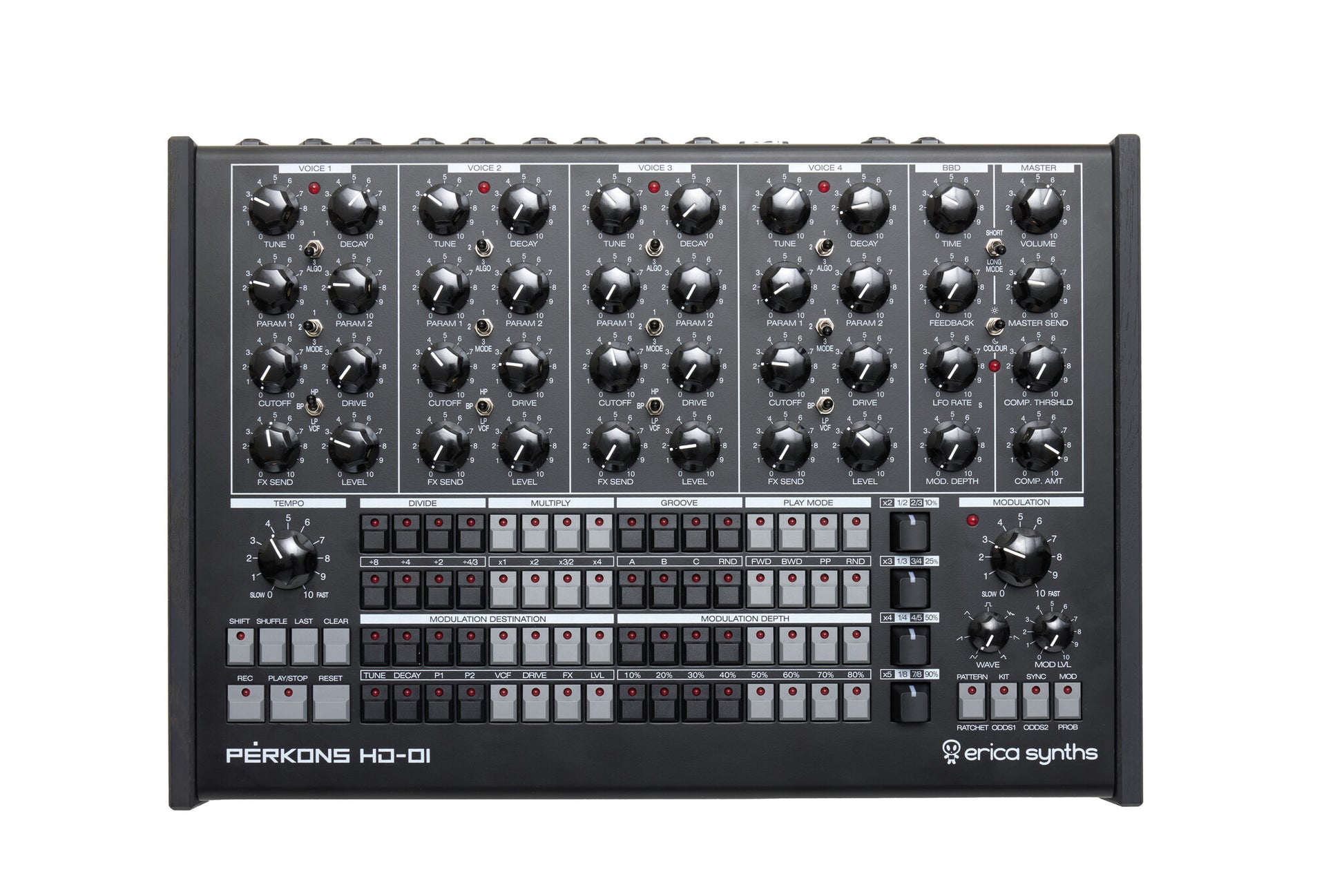 PĒRKONS features four sonically versatile hybrid voices (digital sound engine + analogue multimode filter with overdrive) and a sequencer with simultaneous control over all four percussion tracks.