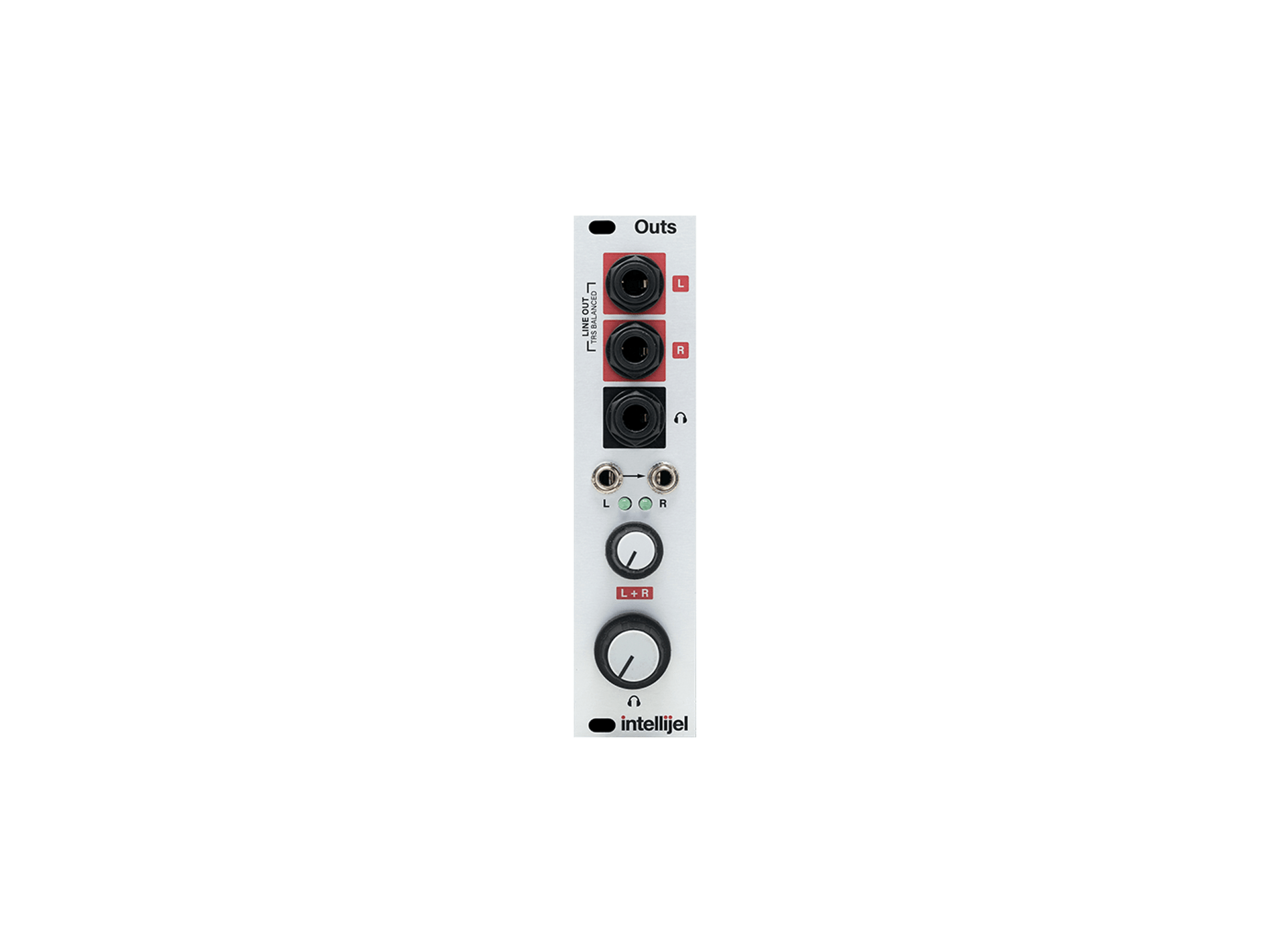 Get Out!Outs enables your modular system to output both professional and prosumer compliant audio, and send it to external amplifiers, mixers, recording devices, or DAW interfaces. Using the L+R Level knob, it scales modular-level voltages down to the level required to drive external gear at either the +4dBu balanced professional line-level standard or the -10 dbV unbalanced standard.Headphone monitoring is also provided via a low noise built-in headphone amp with its own independent level control, capable of driving a wide range of impedances — from studio grade headphones to portable style earbuds.To use Outs, simply connect the final output of your patch to the ⅛” inputs. The built-in activity LEDs light up to indicate the presence and intensity of the input signal. The left input is normalled to the right, so you can create a stereo signal from a mono source. Or if you have an Intellijel Mixup, you can remove a jumper from its rear panel, and connect it to the Outs module using the 3-pin link cable included with the Mixup.Features