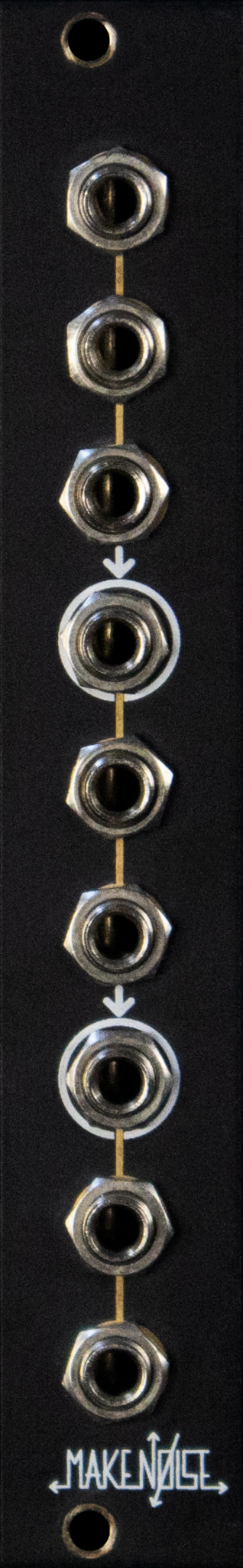 Within the Make Noise system the Multiple may also be used for combining clock, gate and pulse signals together to create interesting timing sources (in other words, it acts as a Gate combiner aka logic OR circuit). It has 9 inter-connected sockets that may be split into different group combinations depending upon how it is patched. The jacks circled in white will make or break the interconnects between the 3 groups of three, thus allowing for three 3-way, one 5-way/ one 3-way or one 7-way multiple. The Multiple is passive, because the Make Noise system does not require Buffered Multiples since all critical control signals are already buffered in such a way as to provide a large fan-out capability.