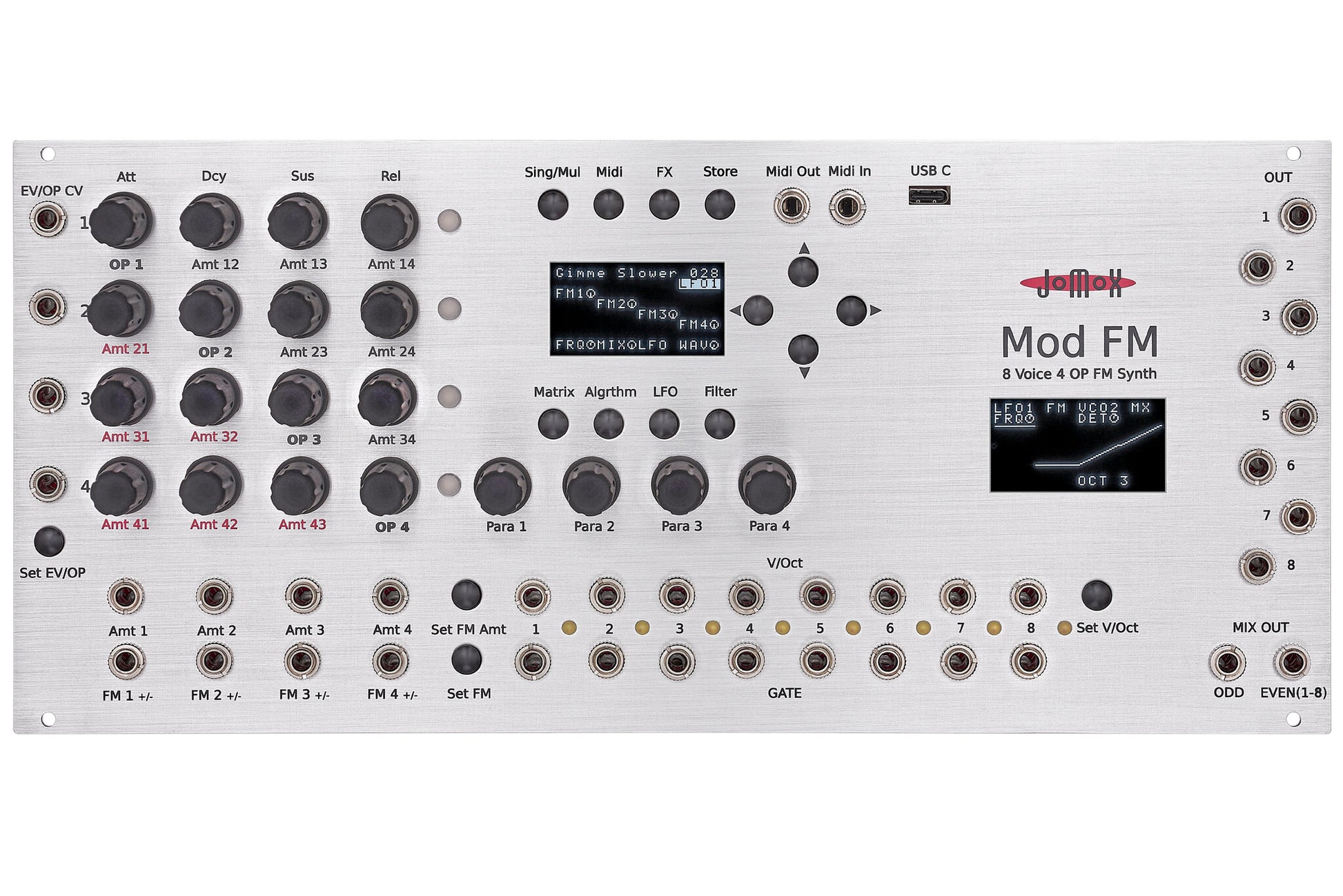 The Jomox Mod FM is a fully self-contained 8-voice FM synthesizer in Eurorack format. Combining a digital FM engine with true analog filters, VCAs, and modulation capabilities, the Mod FM bridges the gap between classic FM synthesis and analog warmth.