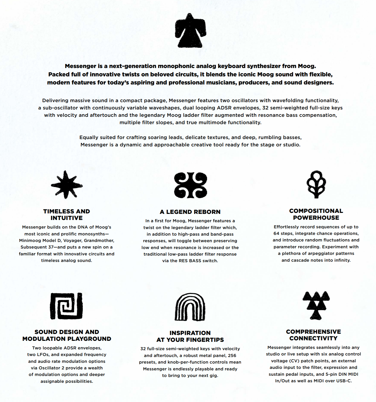 The Moog Messenger is a next-generation monophonic analog keyboard synthesizer that blends classic Moog warmth with innovative, modern features. Designed for musicians, producers, and sound designers, it delivers a powerful sound in a sleek, portable form.