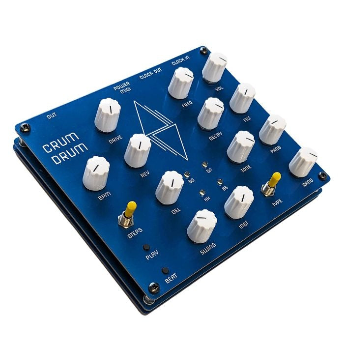 Crum Drum is a four‑voice drum machine kit (Kick, Snare, HiHat, Bass‑FM) with built‑in randomization and probability‑based sequencing. Designed by NYSTRÖM, it sparks creativity with internal random sequencer, MIDI/USB control, and analog‑clock sync. Press the Beat button to generate new patterns—adjust Probability for evolving grooves and Randomness for parameter modulation that keeps every performance alive .