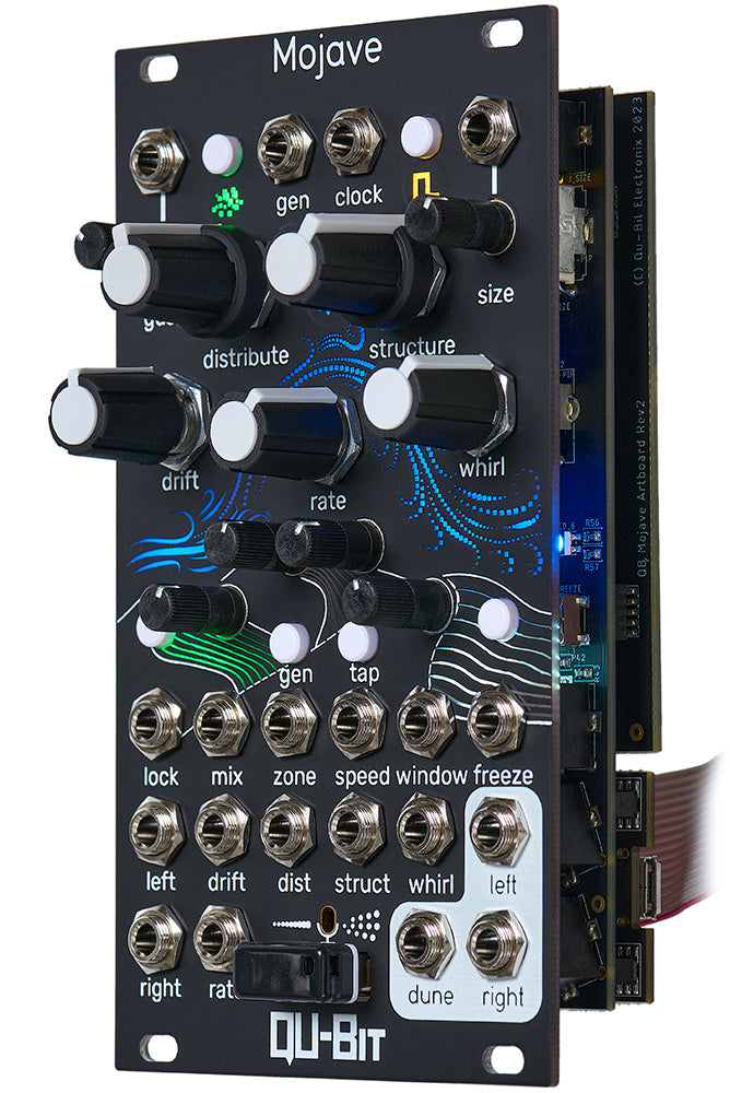 The core of Mojave’s sound design palette is a unique set of melodic and rhythmic controls that presents each grain in a compositional context. Generate clock-synced granular arpeggios, or envelope your sound in rich harmonic swirls with the turn of a knob. All microsound settings can be easily accessed via individual knobs letting you tailor each grain, and effortlessly construct dunes of sound. Mojave is not exclusive to modular signals either; become the wind itself by using the onboard microphone to sift through and manipulate acoustic audio.