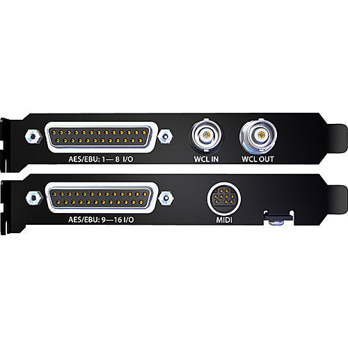 The main board contains the Wordclock I/O and a 25-pin D-sub connector that provides 4 AES inputs and 4 AES outputs (8 channels each) via a standard digital breakout cable that conforms to Tascam's pinout. The Wordclock input operates on single, double and quad speed signals automatically. The expansion board does not require an additional PCI slot and adds channels 9-16 and a connector for a MIDI breakout cable with 2 MIDI I/Os (4 x 5-pin DIN connectors).
