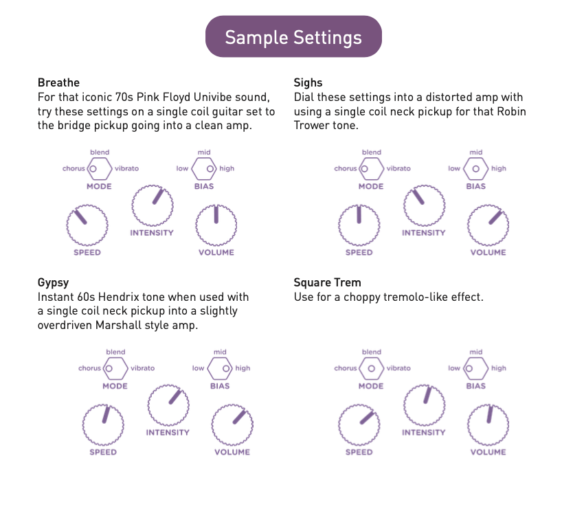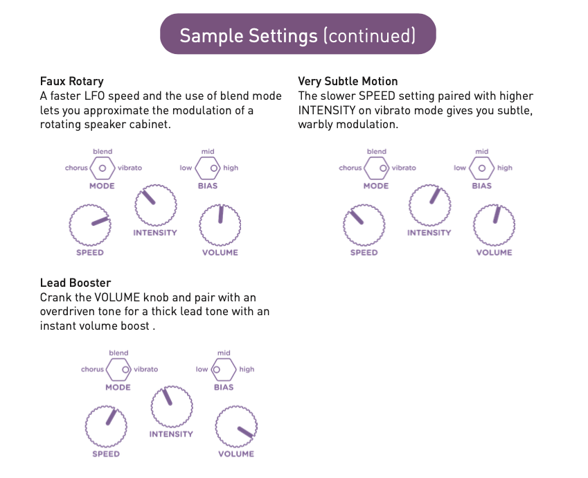 In addition to the familiar Chorus (50% wet) and Vibrato (100% wet) settings, there is a new Blend setting (30% wet) for an inspiring variety of more subtle effects.