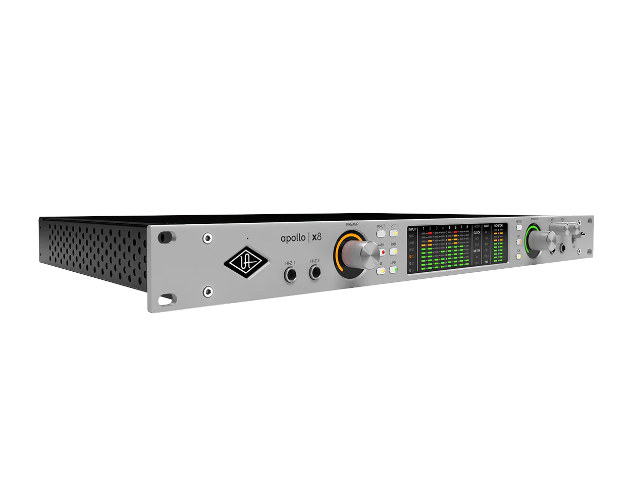 UA's most advanced Apollo x8 is here. For creators and producers running bigger projects who need highest-resolution audio conversion, four Unison™ mic preamps, and realtime UAD processing — which lets you record through plug-ins from Auto-Tune, Neve, API, Manley, and more without latency — Apollo x8 puts legendary UA sound and craftsmanship right in your rack.