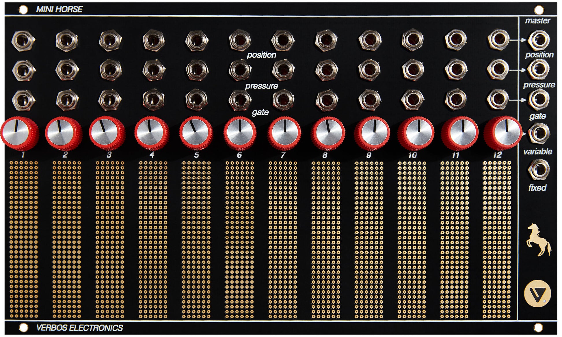 The Mini Horse is a multi-dimentional touch activated voltage controller. At 42HP wide and ultra thin, it can be added to a synthesizer system either inside the Eurorack or out front in the forthcoming Black Box extra low profile powered enclosure. Twelve keys run across the front, each with its own Gate out, Pressure out and Position out. In addition to the individual keys’ outputs the master section presents the parameters of which key was last pressed in addition to a tunable from the knob behind the key and a “Fixed” voltage, spanning from 0-10v across the keys from left to right. Position outs have memory of their position when last touched, allowing the user to draw a mix across the keys when connected to voltage controlled mixers as in the Harmonic Oscillator or Bark Filter Processor.