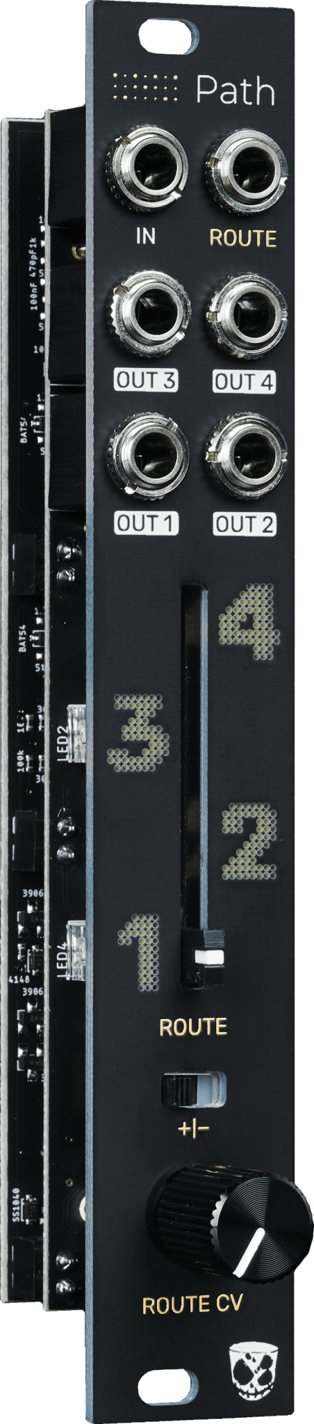 Path smoothly routes one signal to four possible outputs, fading from one to the next with a custom soft slope response for seamless transitions. Like Trace, it features a DC-coupled interpolating circuit at its core, making it perfect for routing audio, CV, or any signal you choose.